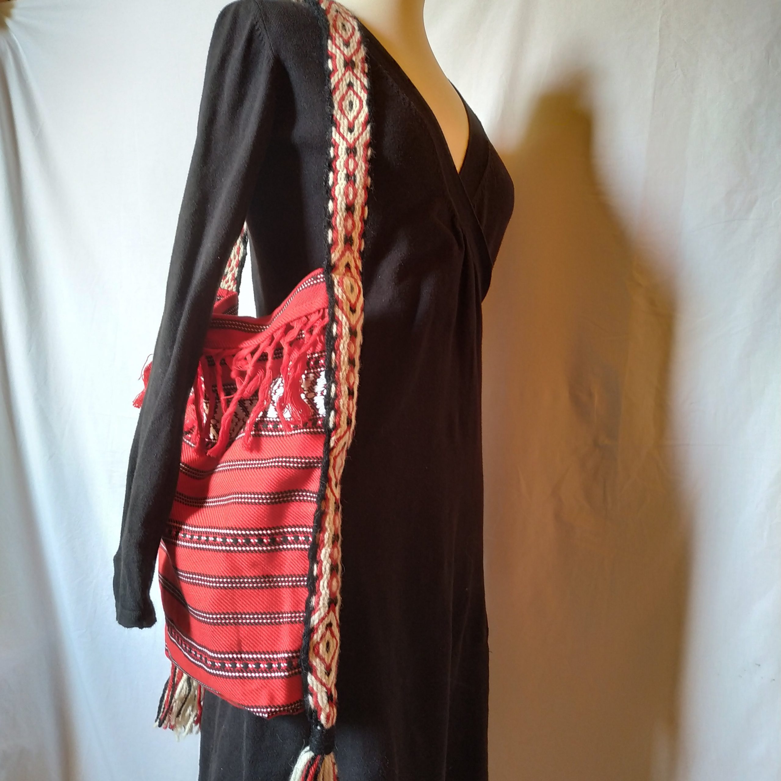 Deze tassen zijn gemaakt van een tafelkleedje uit Roemenië. De hengsels zijn of een tailleband, afkomstig van mijn kostuumvoorraad uit mijn tijd als dansdocent.